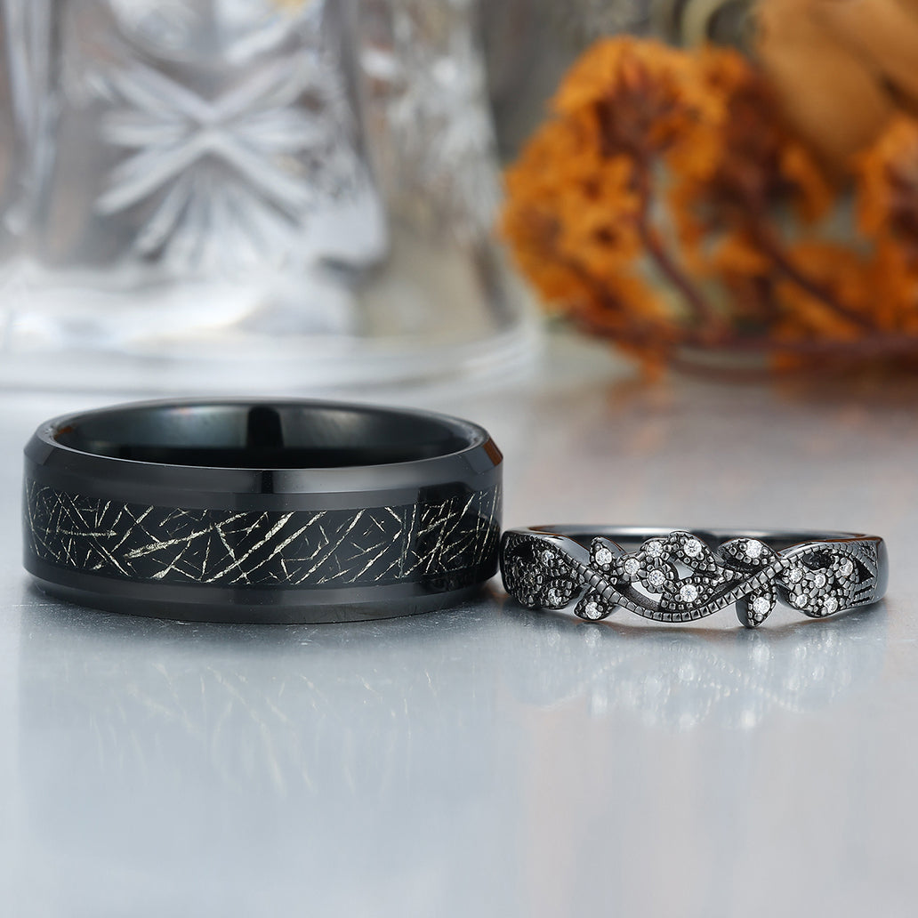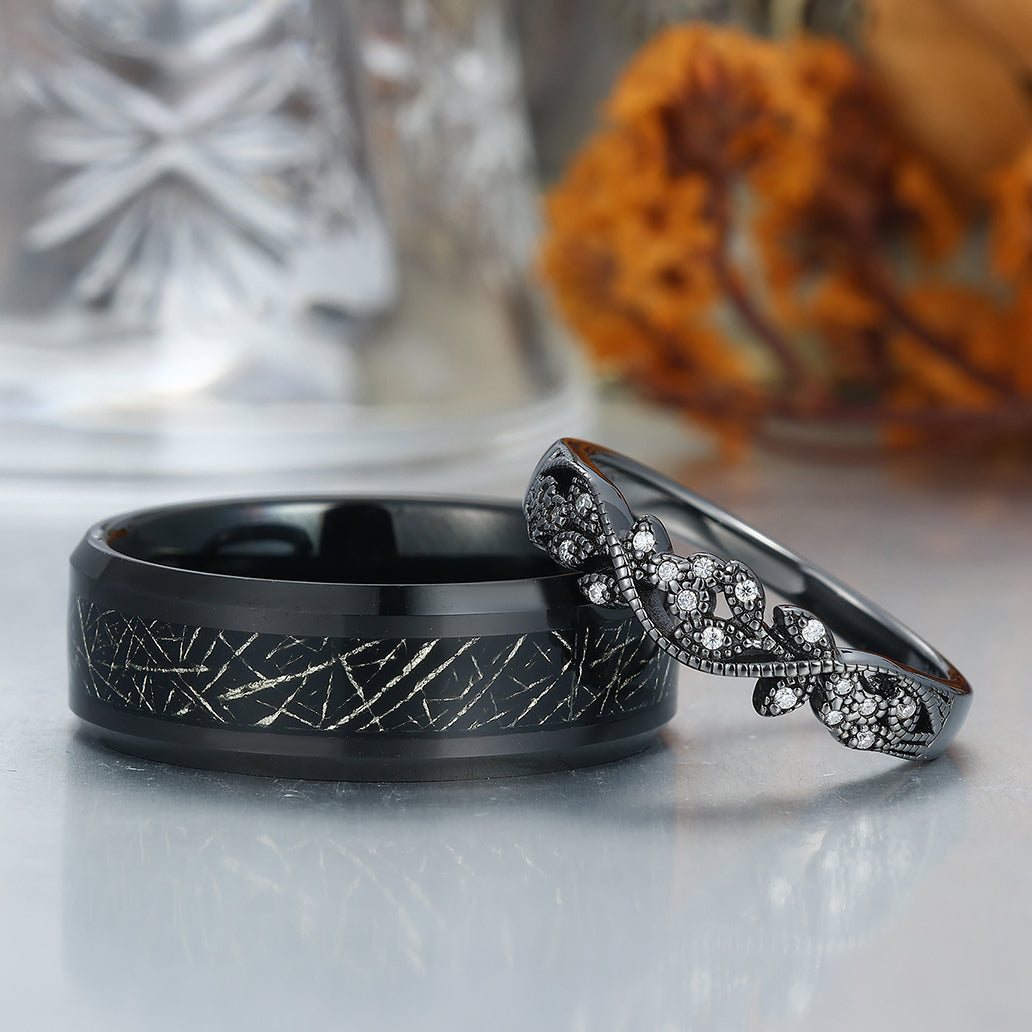 Vintage Black Rutilated Quartz Gold Leaf Tungsten His and Hers Ring Set