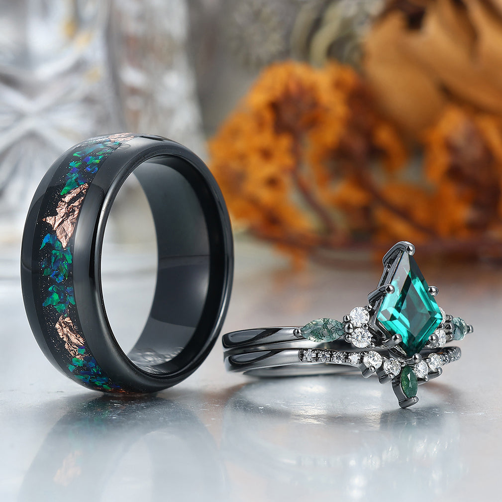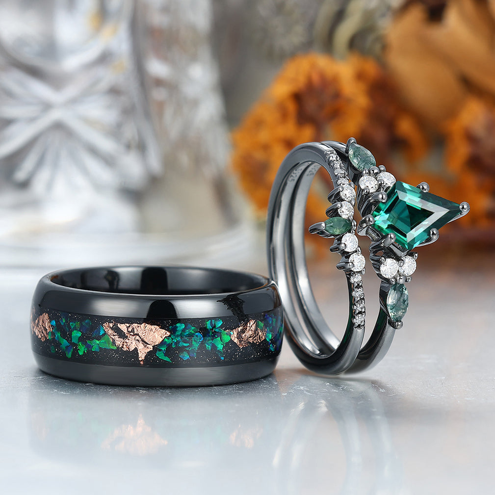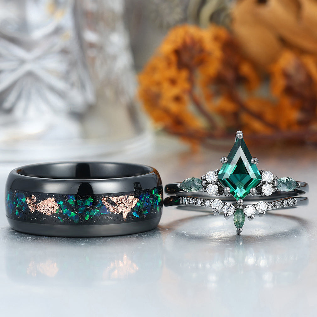Vintage Kite Emerald Ring Couples Ring Set Sliver His and Hers Wedding Band