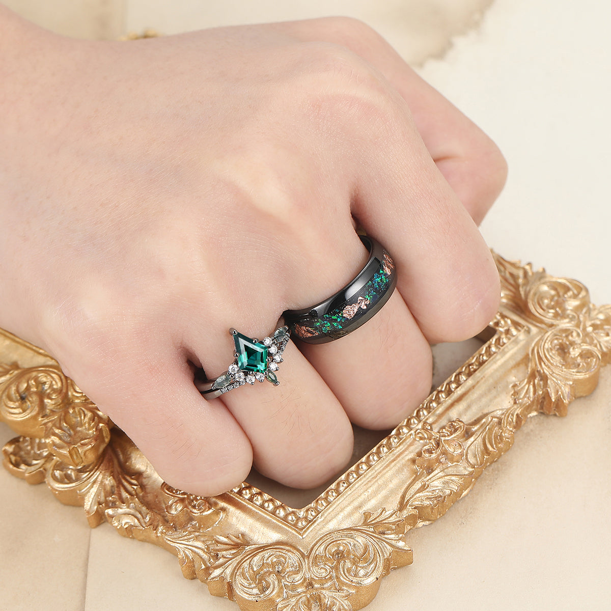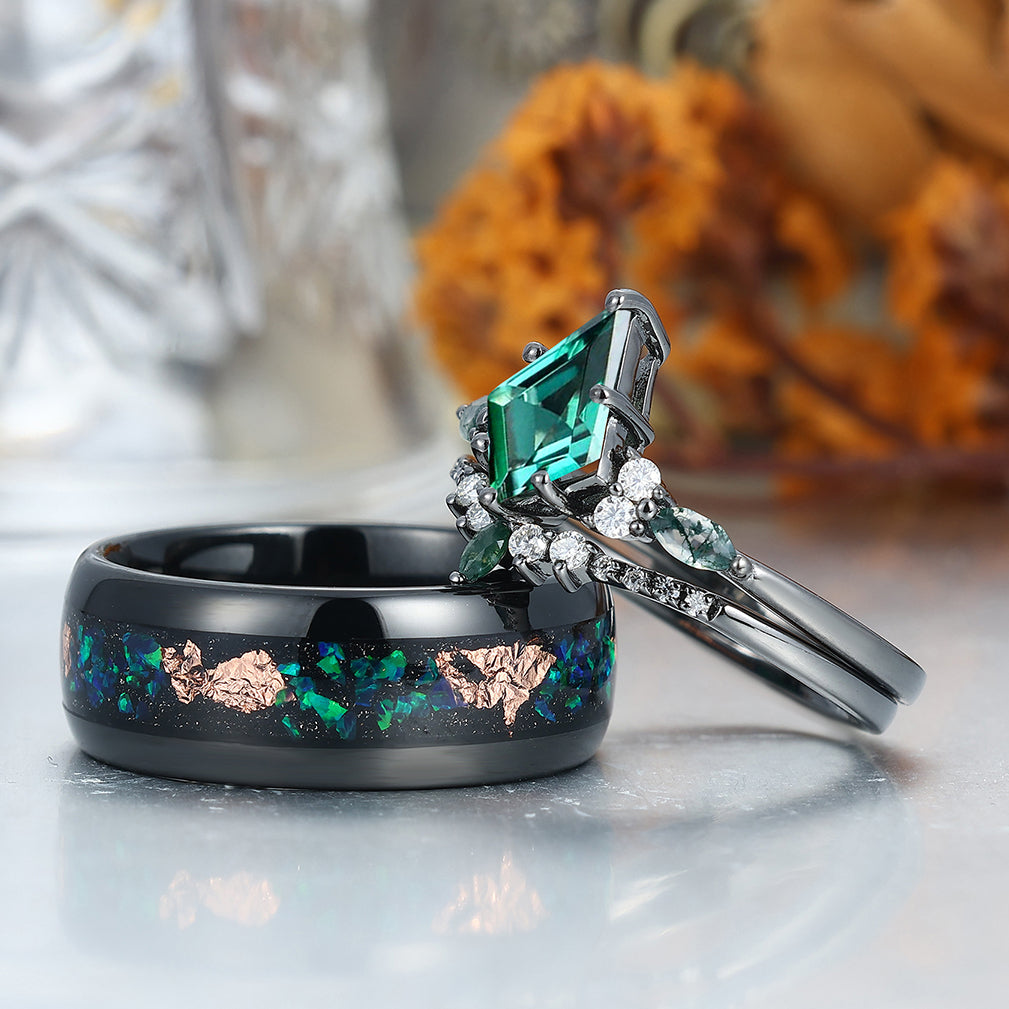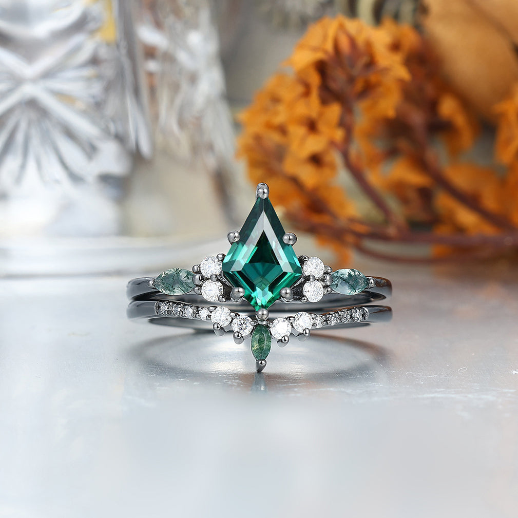 Vintage Kite Emerald Ring Couples Ring Set Sliver His and Hers Wedding Band