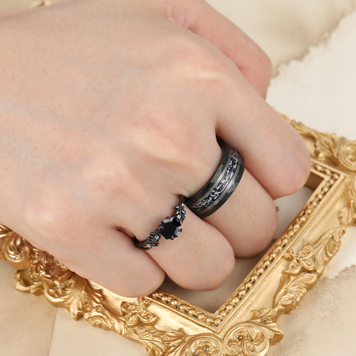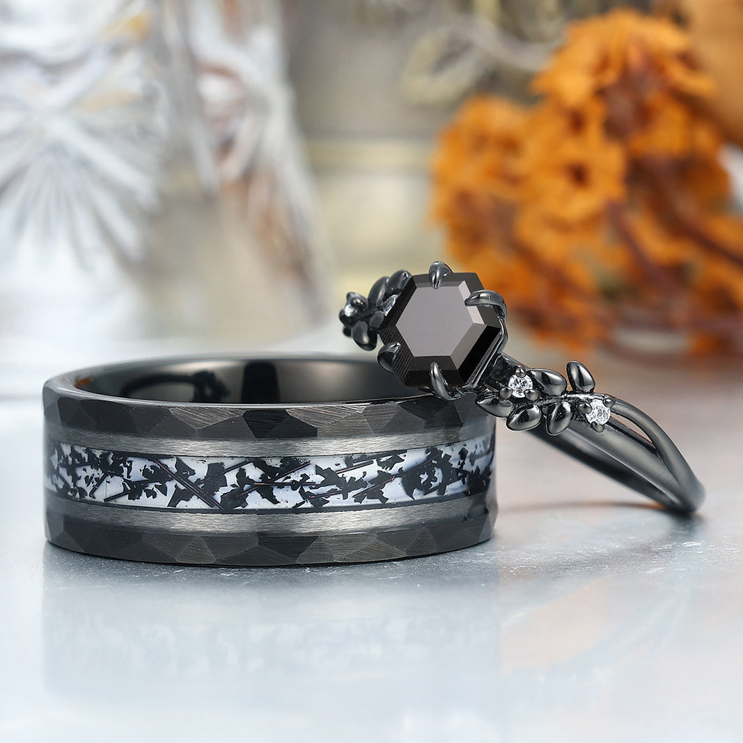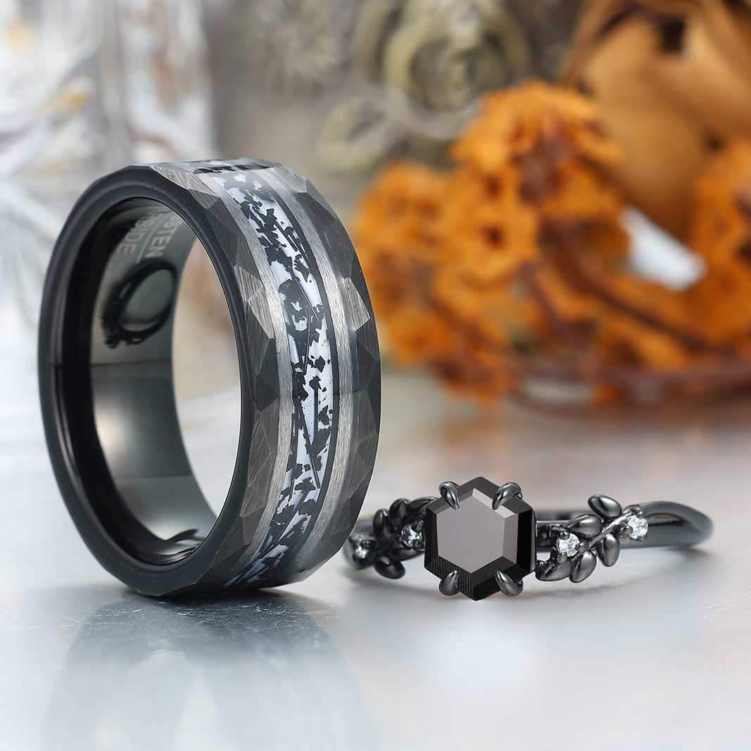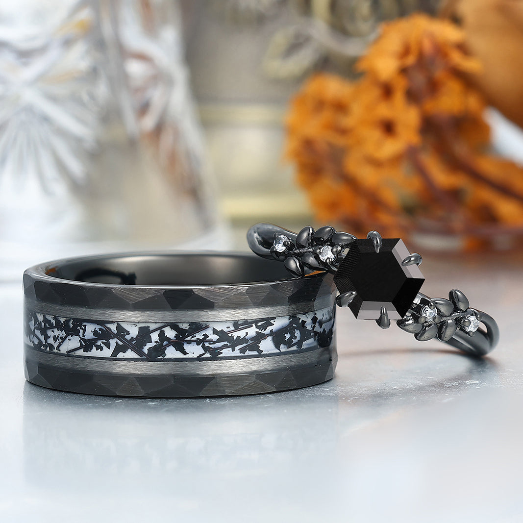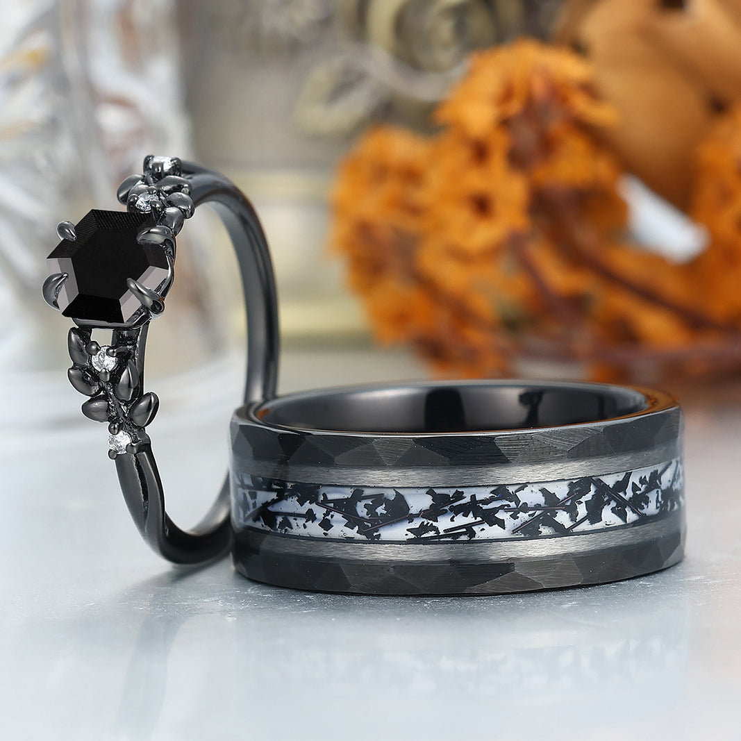 Wheat Design Natural Black Onyx Couple Rings Personalized His And Hers Wedding Bands