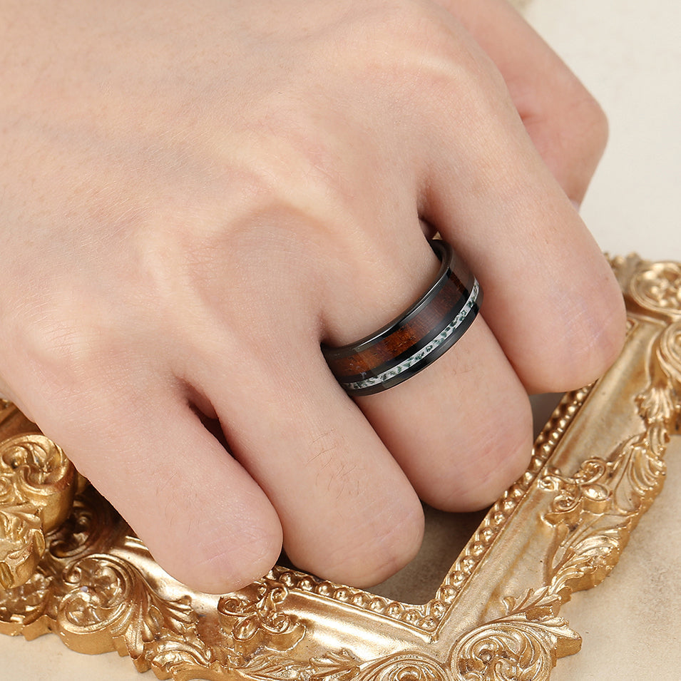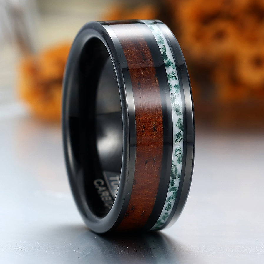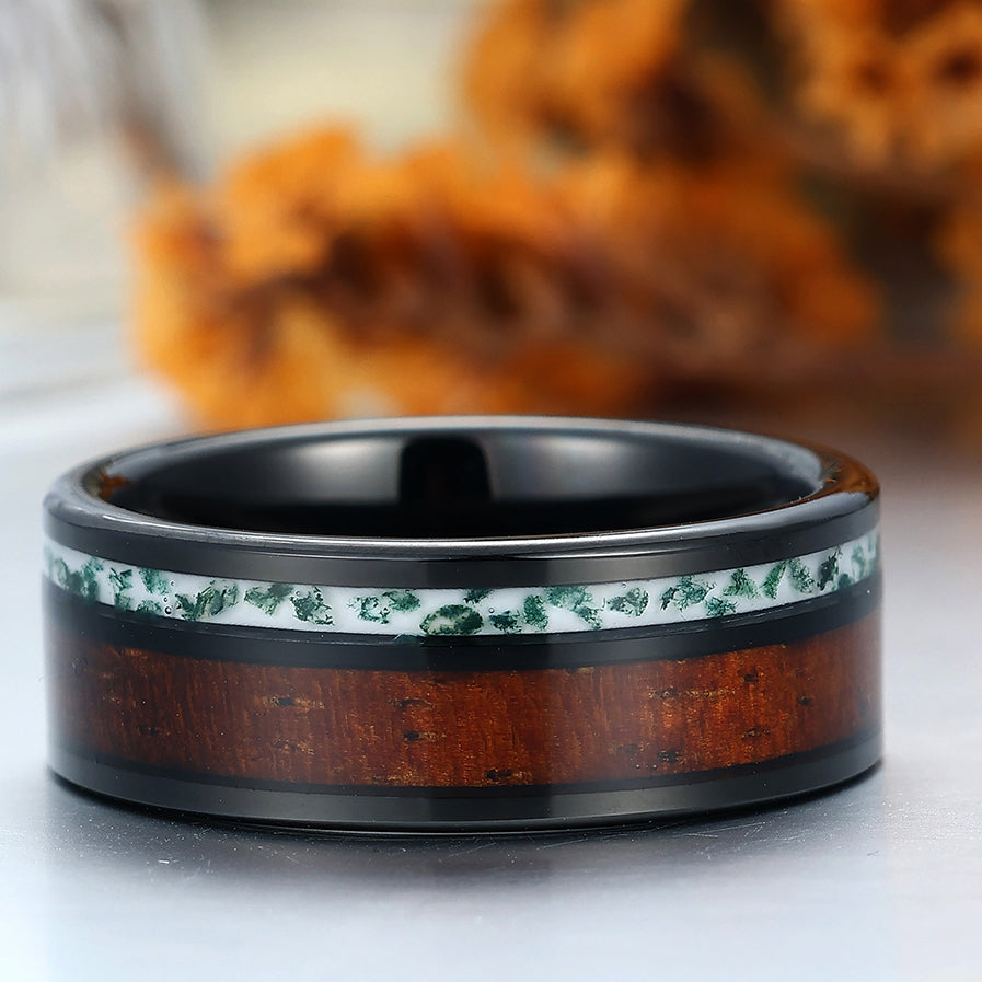 Metal Type: Tungsten Carbide - Crushed Moss Agate and Wood Strips Inlay - Hypoallergenic