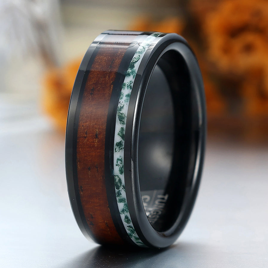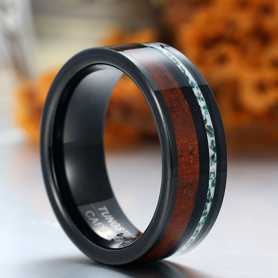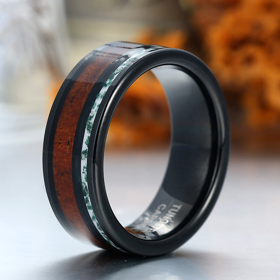 Wood Strips Moss Agate Tungsten Men's Wedding Band Black Men's Unisex Ring