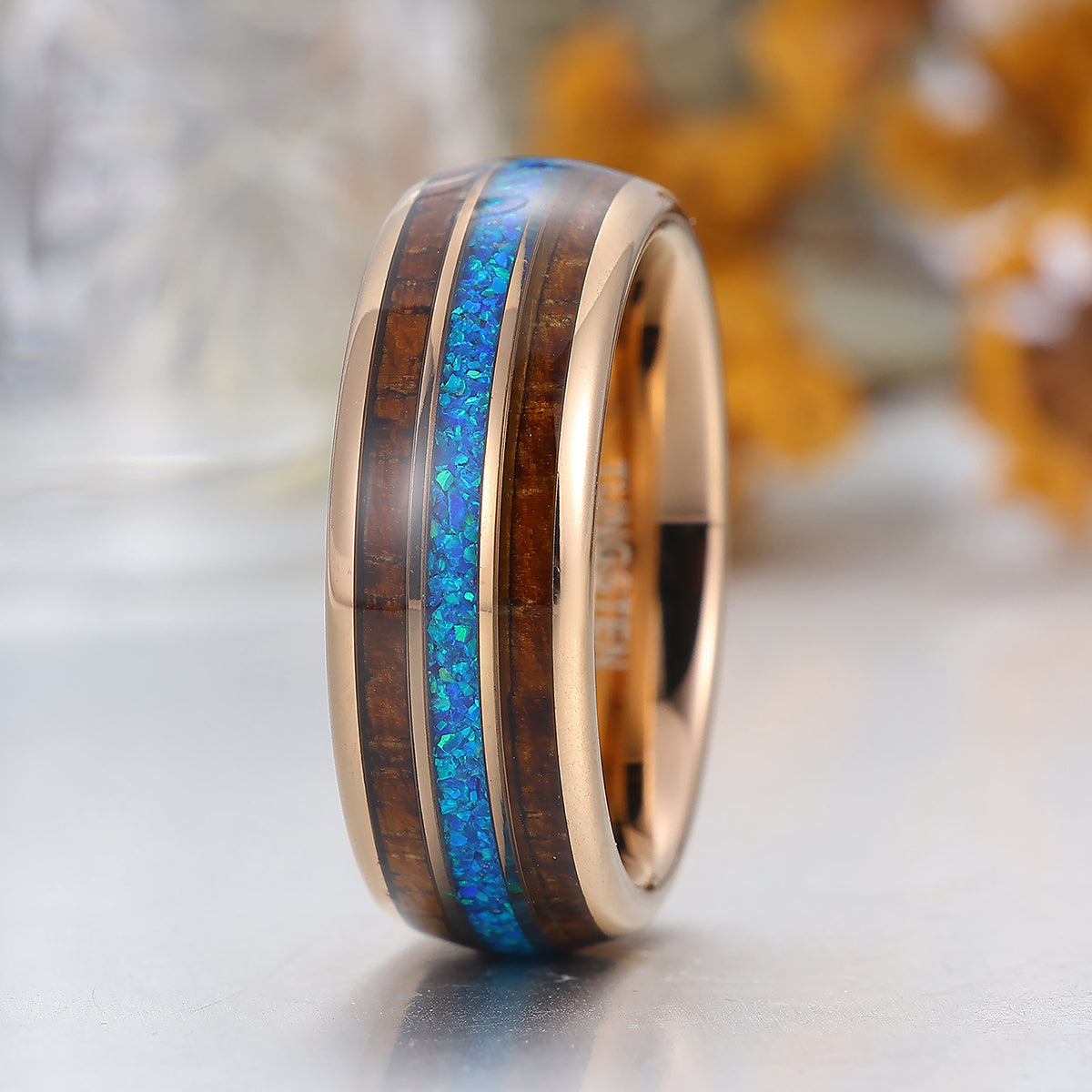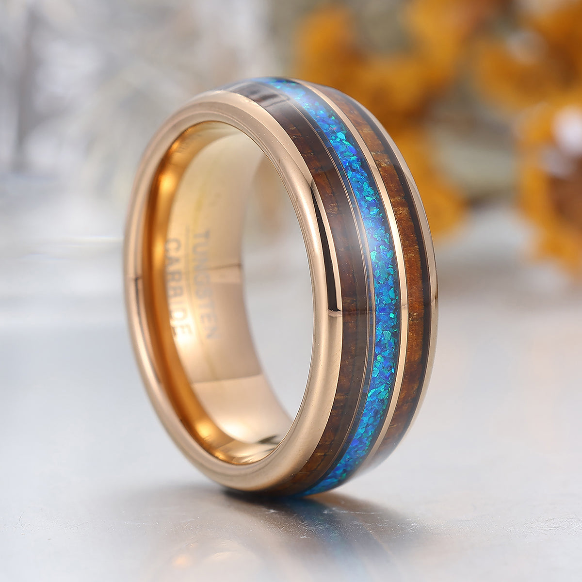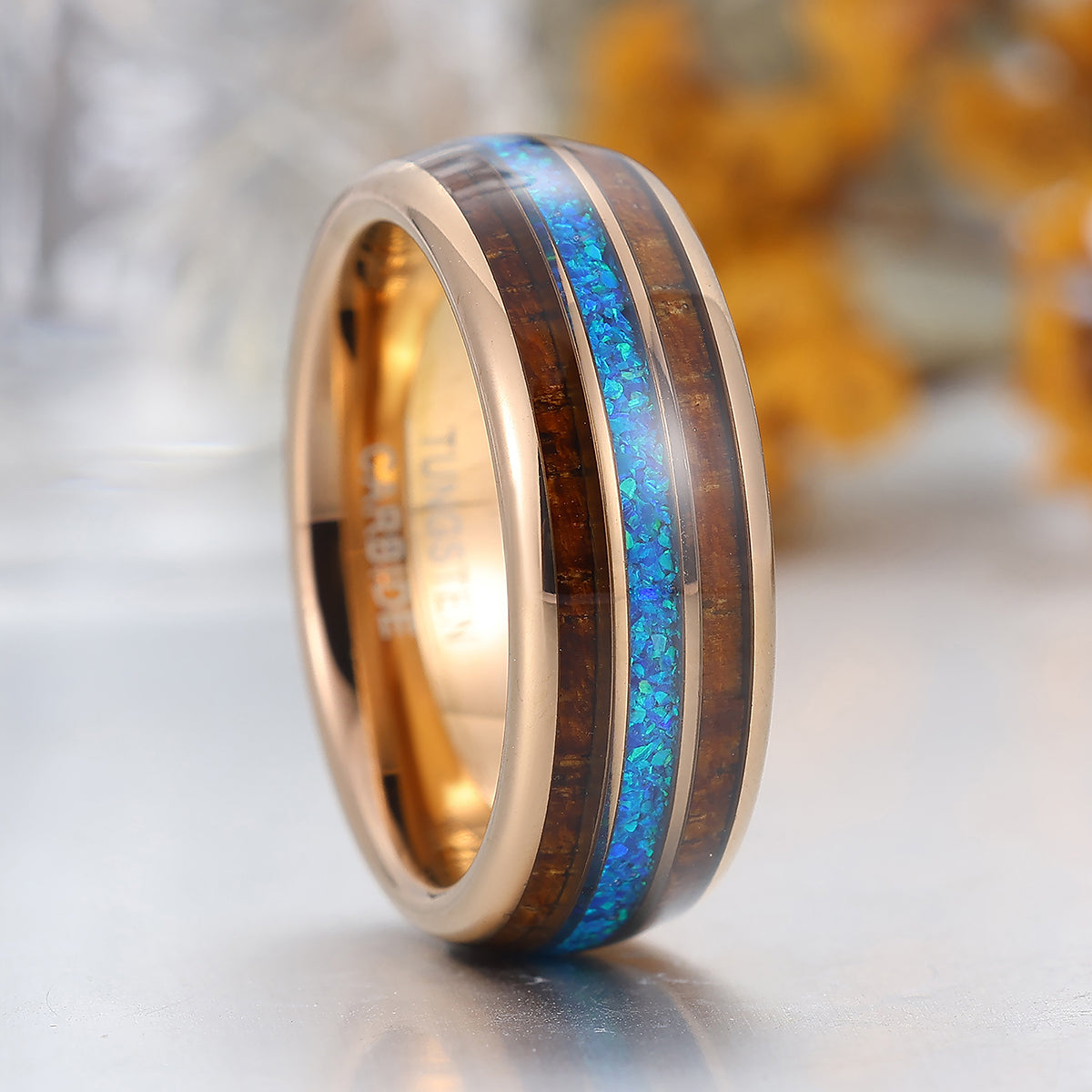 Wooden And Blue Opal Inlay Tungsten Ring Rose Gold Polished Dome Men's Wedding Band