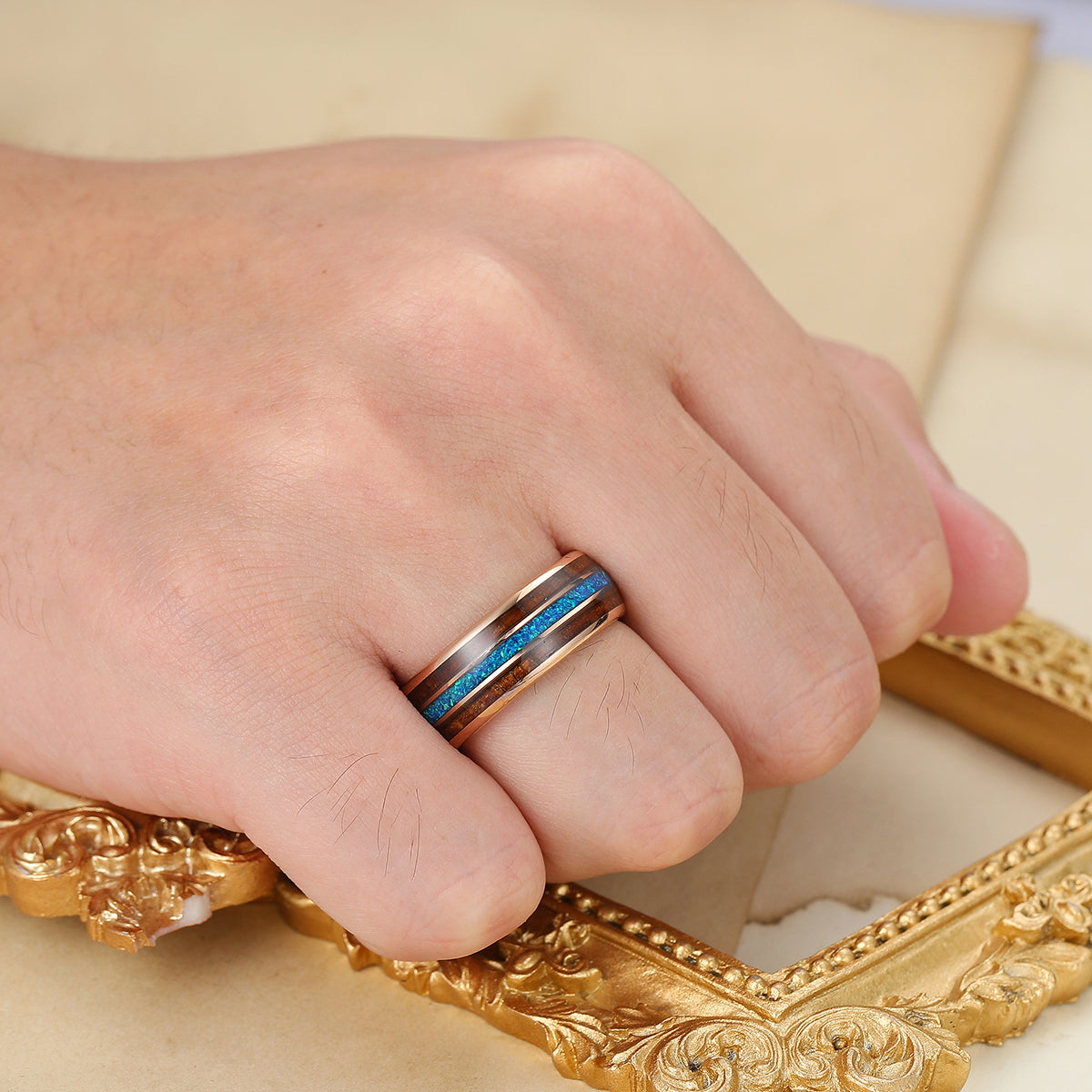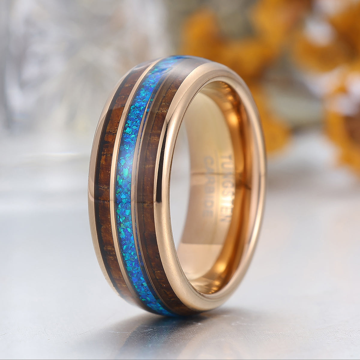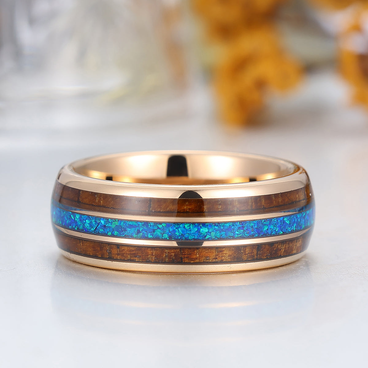 Wooden And Blue Opal Inlay Tungsten Ring Rose Gold Polished Dome Men's Wedding Band