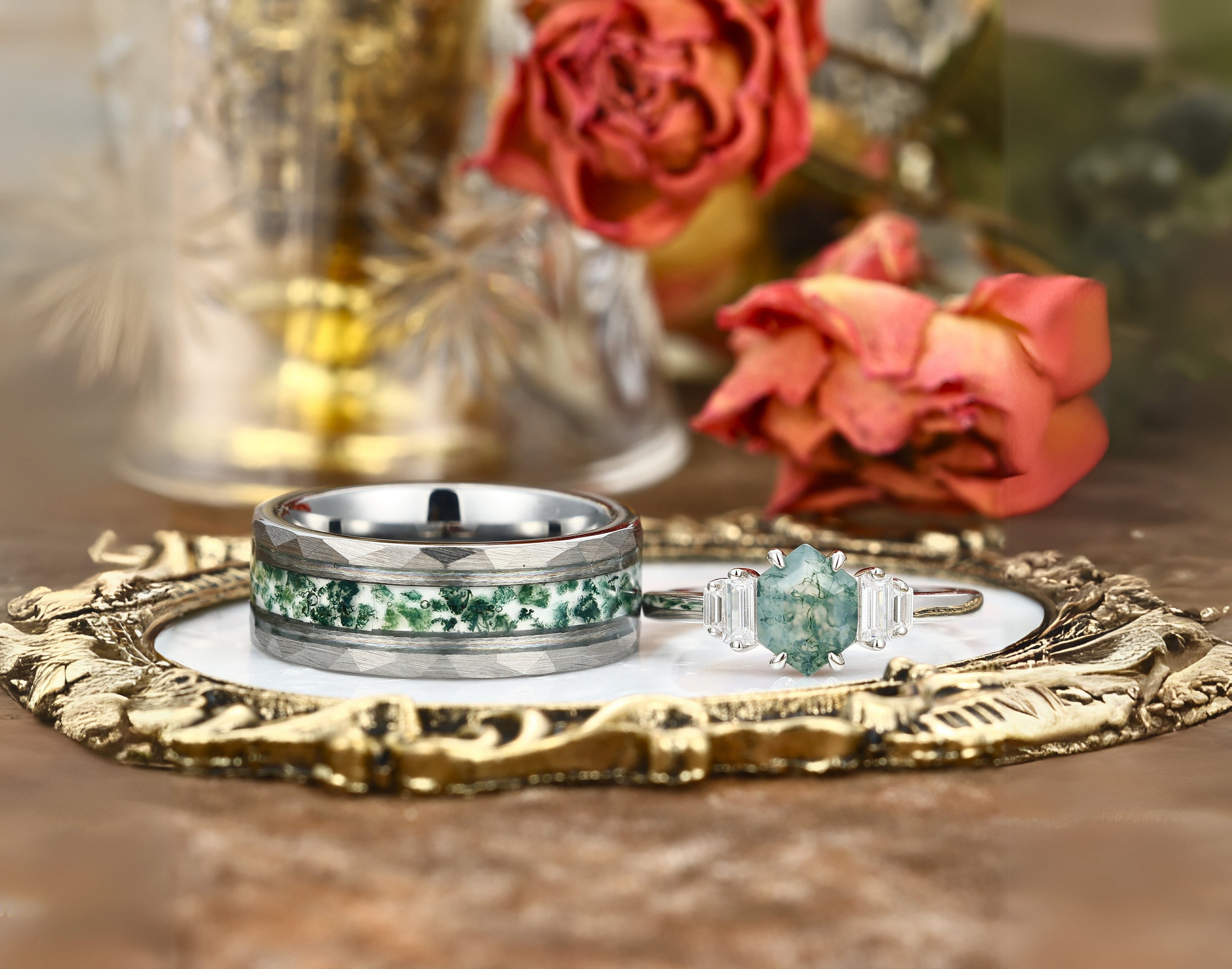 Vintage Natural Moss Agate Milgrained Filigreed Couples Ring Matching Rings Wedding Ring Set